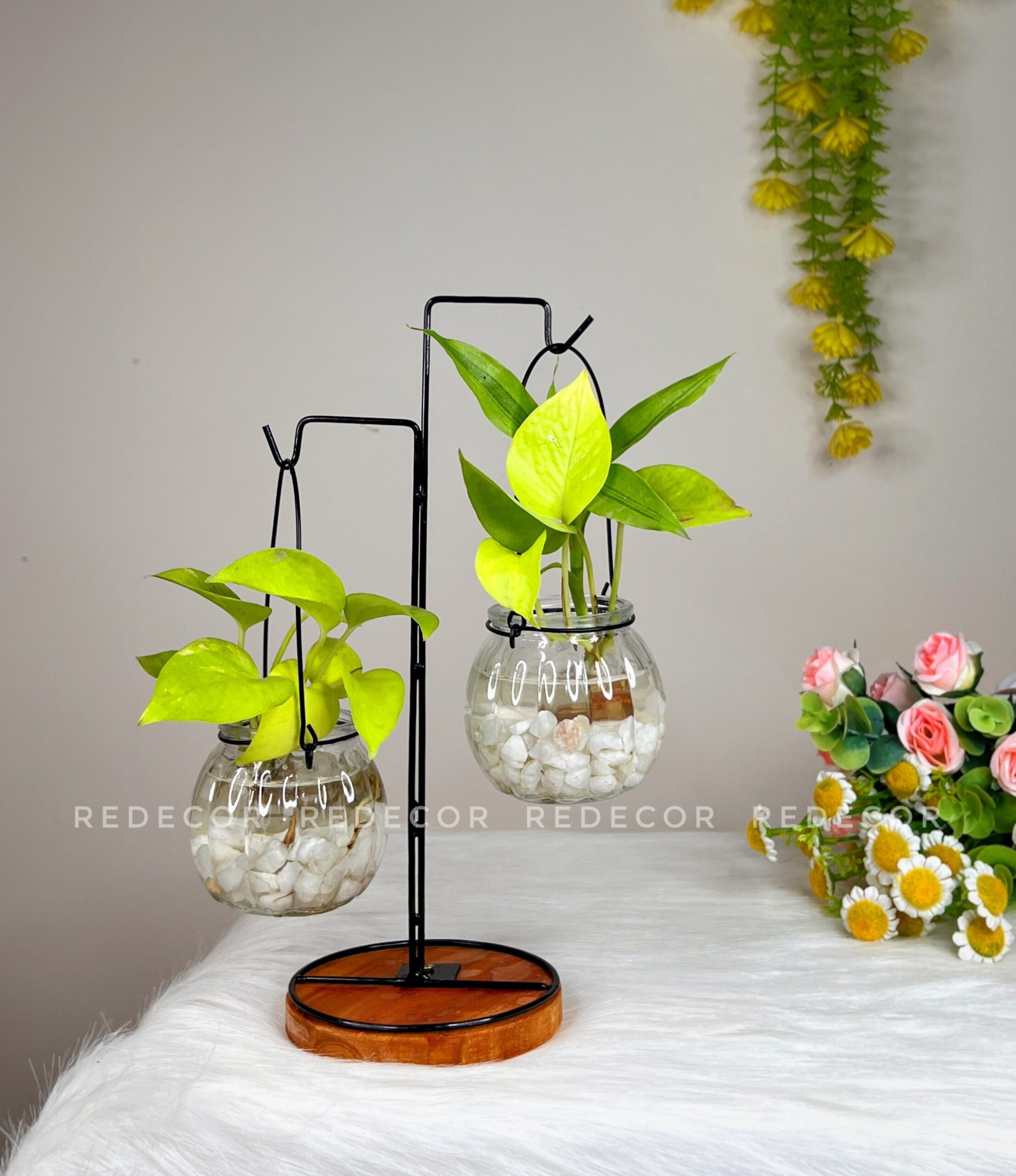 RedecorBD-এর মার্জিত মেটাল স্ট্যান্ডে গ্লাস পটের মানিপ্ল্যান্ট সেট